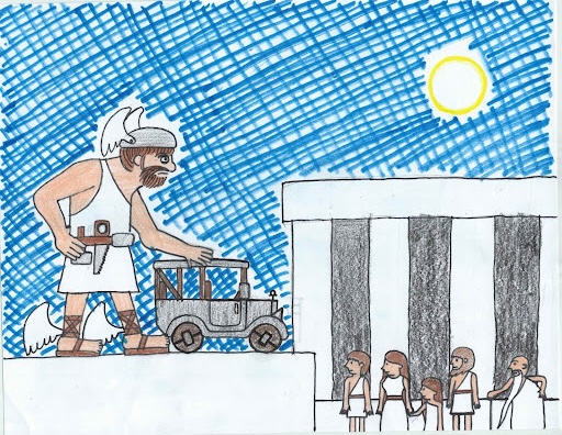 “That’s the best part,” explained Hephermes. “The car doesn’t need horses. It can move on its own! It runs on oil that comes out of rocks. I’ve set up little shrines on the sides of roads all around Greece where, if you leave an offering of coins for me, you can fill your car with more oil. The car can travel faster and farther than any animal or chariot that exists. Buy one and see for yourself!”